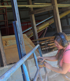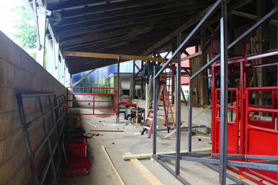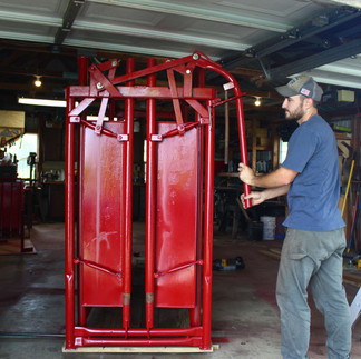 We started by securing metal and wooden beams to make sure the structure was sound. Next, we knocked out a wall to allow a truck and trailer into the barn more easily. We cemented areas of the floor for repairs and building pads. We welded, sanded, and painted salvaged gates then hung them in the barn. Later we built a crowding pen with narrow passage that will lead to either a headgate or loading chute depending on what is needed. Caleb designed the loading chute to be adjustable to any height needed for the truck or trailer being used. He spent days welding and fabricating the chute.